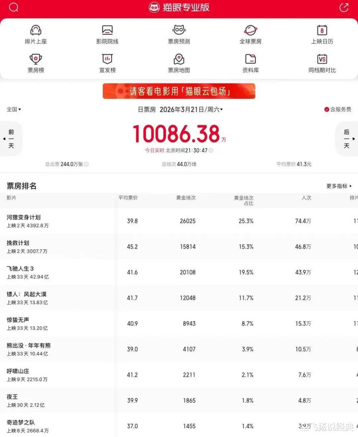 3月21日,周六,电影大盘拼凑过1亿。