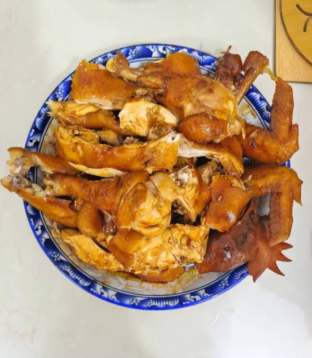7. 将煮好的酱油鸡取出,稍稍放凉后切成小块,装盘即可。